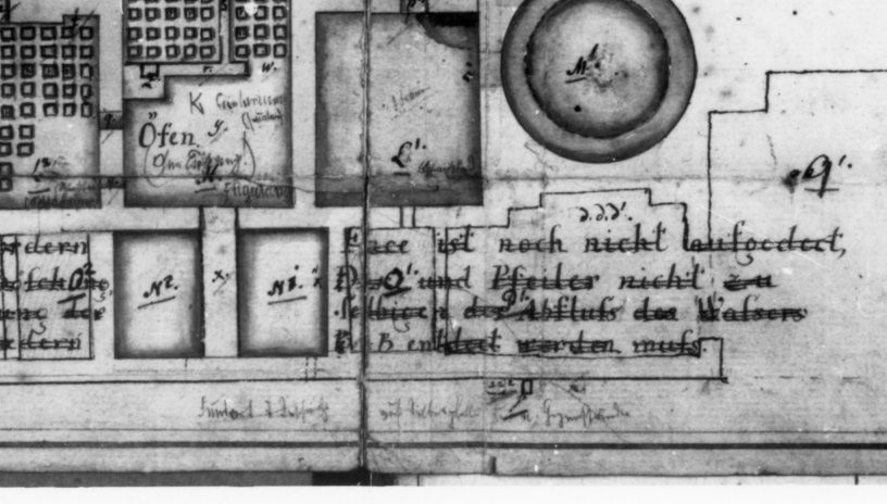 Bei den Ausgrabungen des römischen Heilbades von Badenweiler im Jahr 1784 hat man insgesamt recht wenige Funde geborgen. Einige der bedeutenden Entdeckungen hat der Geometer von Weißensee in seinen detaillierten Grabungsplan vom August 1784 aufgenommen. So weist vor dem westlichen Teil der Südfront eine mit Bleistift eingetragene Inschrift „viele Kohlenreste viele Glasscherben im Schutt“ aus. [1] In der Tat lassen sich Fensteröffnungen anhand von Glasfunden und Fenstersprossen nachweisen. [2] Ebenso erweist eine Beischrift im westlichen Vorhof den „Fundort aller Steininschriften“, zu denen auch jene Fragmente gehören, die wir im Laufe der Bearbeitung der Funde dem Weihestein der DIANA ABNOBA zuweisen konnten. [3] Schließlich erzählt eine weitere Notiz auf dem Grabungsplan unmittelbar außerhalb der Nordwand des Thermalbades von dem „Fundort d. Beschriftung auf Silberplatte u. a Gegenstände“. [4] Die Pläne, die im Zuge der Ausgrabung dieses exorbitant gut erhaltenen Badgebäudes erstellt wurden, sind alle gesüdet. Sie haben – nicht zuletzt dank der Fülle der Beischriften – hohen dokumentarischen Wert. Im Zuge der Grabungen und der Neuaufnahme des Bestandes [5] in den Jahren 1979 bis 1982, durchgeführt vom Verfasser als Vorbereitung zu einem generellen Schutz der Ruine, [6] entstanden die neuen, fotogrammetrisch erstellten Pläne, [7] die in etlichen Details von den früheren Gesamtaufnahmen abweichen, die aber vor allem eine recht andere Baugeschichte [8] sichtbar werden ließ, als in dem Werk von Hermann Mylius dargelegt. Doch das ist nicht das Thema dieses Beitrags.