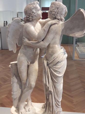 Zu offensichtlich, um unentdeckt zu bleiben, ist die gut 1,30 m hohe Skulpturengruppe von Amor und Psyche aus weißem Marmor im Obergeschoss der Antikensammlung. Die Gruppe wird in das 2. Jahrhundert n. Chr. datiert. Doch die Forschung nimmt an, dass das Motiv auf späthellenistische Vorbilder des 1. vorchristlichen Jahrhunderts zurückgeht. Seine mythischen Ursprünge sind sogar noch älter, wobei es vor allem der Schriftsteller, Philosoph und Redner Apuleius von Madauros (ca. 123 -170 n. Chr.) gewesen ist, der die Geschichte von der Königstochter Psyche (Seele) und des Liebesgottes Amor in seinen „Metamorphosen“ ausführlich beschrieben hat.
