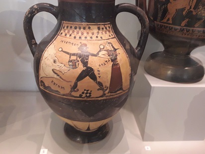 Das Bild erweckt den Eindruck, als wolle er das Wildschwein, das eine etwas zu lange Zunge besitzt, mit einer Handvoll Kugeln oder Eiern bewerfen, während Andromeda die Hände in einem dunklen Muff vergräbt, der wohl den Felsen, der sie gefangen hält, symbolisieren soll. Dass es sich um eben diese Rettungsszene handelt, weiß man anhand der Inschriften, welche die Namen der Beteiligten nennen. Allerdings linksläufig – ähnlich wie die phönizische Schrift – und unter inkorrekter Verwendung der griechischen Buchstaben (u. a. wird bei „Ketos“ ΚΕΤΟΣ ein Epsilon anstelle eines Eta verwendet). Ob dies möglicherweise absichtlich geschah, bleibt offen. Da die Amphore von ihren Maßen her nicht sonderlich groß ist, dürften viele Besucher wohl an der mythischen Szene vorübergehen. Etwas, das mir ebenso ging, ehe ich sie bei meinem vergangenen Besuch nicht mehr ignorieren konnte. Dinge finden einen, wenn sie es möchten. Oder finden wir sie?