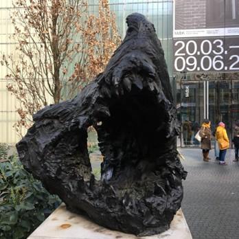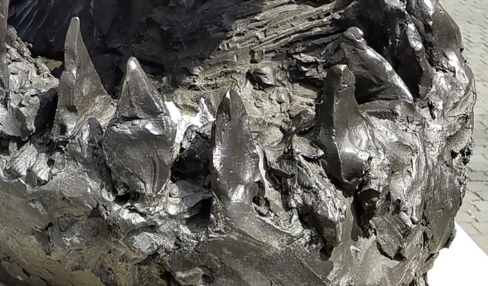 Es handelt sich um die Bronzeskulptur der Künstlerin Stella Hamberg (* 1975) „das ist das“ aus dem Jahr 2015 – ein merkwürdig belangloser Titel für ein eindringliches Werk wie dieses. Dargestellt ist das weit aufgerissene Maul eines Ur-Tieres. Man denkt wahrscheinlich als erstes an einen Hai, aber die übergroßen, spitzen Zähne verorten dieses Ungetüm eher im Tethysmeer einer Vorzeit, die wir mit vielen Nullen umschreiben. Die spitz aufragende Schnauze verleiht der Skulptur etwas Dynamisches und Ungestümes. Die Oberfläche ist unruhig; zeigt noch die kraftvollen Handgriffe der Künstlerin an ihrem Tonmodell. Gleichzeitig aber ist die äußere Umrissform der Skulptur kompakt und definiert und einem Berg nicht unähnlich.