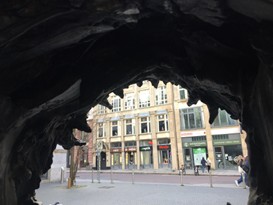 Interessanterweise ist die Skulptur im hinteren Teil nicht geschlossen. Auch wenn das aufgerissene Maul mit den spitzen Zähnen zweifellos die Hauptansicht ist, so kann der Betrachter doch die Perspektive wechseln und aus dem Schlund hinausschauen. Und hier kommen wir noch einmal auf die Assoziation mit dem Berg zurück: Aus der umgekehrten Perspektive sieht das Maul wie der Ausgang einer Tropfsteinhöhle aus. Die Stalaktiten solcher Kalksteinhöhlen wurden wahrscheinlich die längste Zeit mit den Zähnen von Drachen assoziiert, die ja bekanntlich in ihnen wohnen.