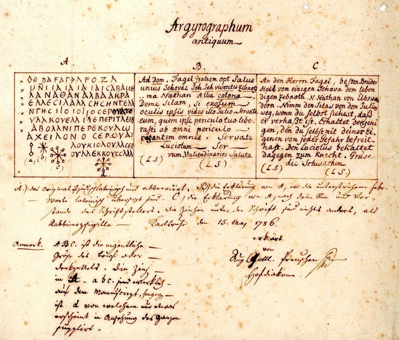 A.) Das Original ist jüdischlateinisch und abbreviert. B) Die Erklärung von A, wo die unterstrichene hebr. Worte lateinisch übersetzt sind. C.) Die Erklärung von A.) nach dem Sinn und Verstande des Schriftstellers. Die Zeichen unter der Schrift sind nichts anderes als Rabbinersigille. [16]
