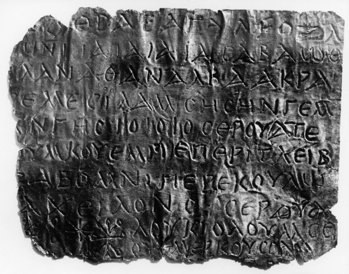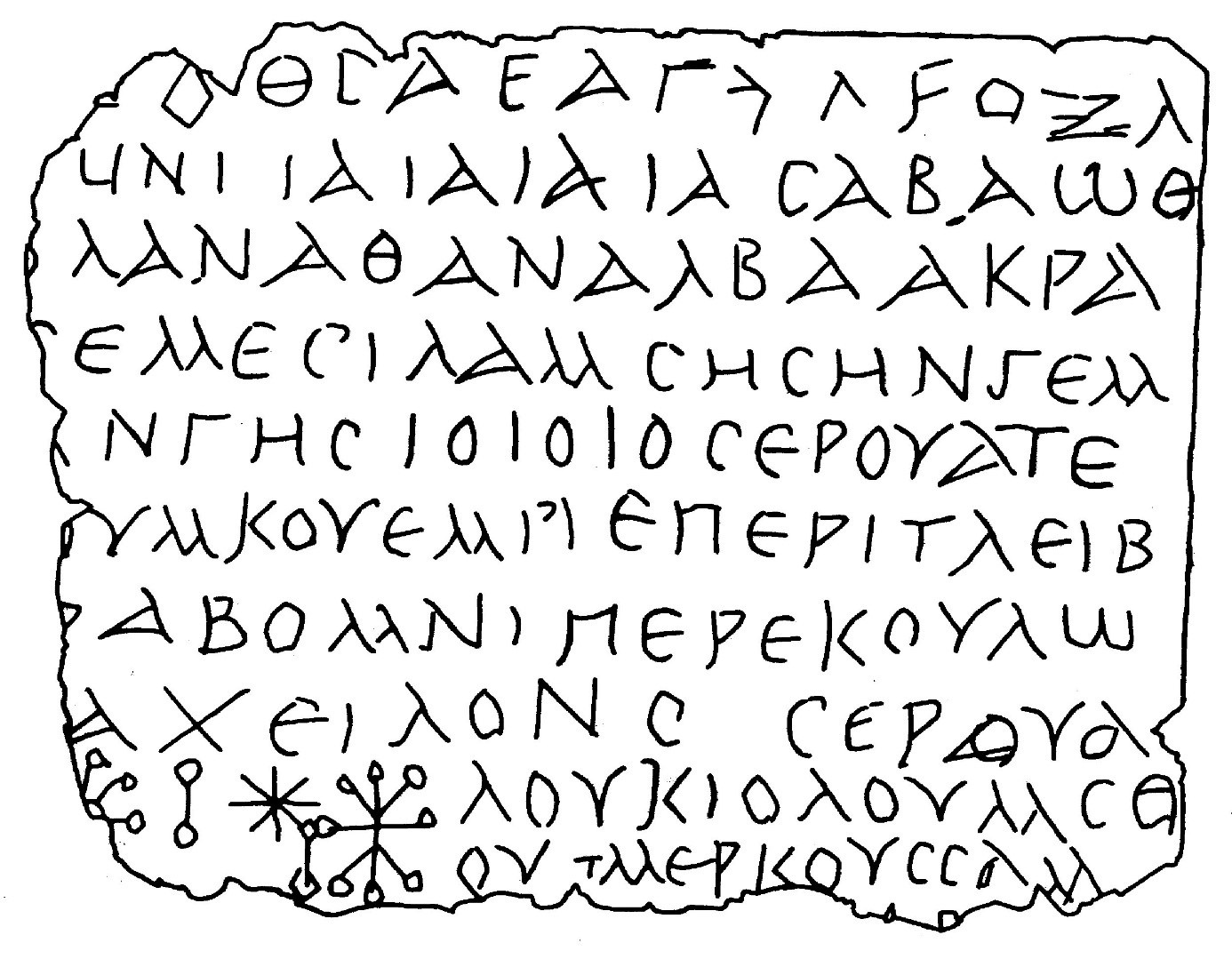 Die erste Zeile setzt im erhaltenen Bestand mit einem eckig [43] geritzten „O“ ein. Es folgen ein Theta und ein unziales Sigma [44] – vielleicht ein Hinweis auf einen Gott: ho theós. [45] Eine solche Lesung wäre jedoch unbefriedigend, da sie, wie soeben gesehen, weder einer Anrufung noch einer Einleitungsformel entspricht. Die übrigen Zeichen dieser ersten Zeile haben noch keine befriedigende Deutung erfahren, auch wenn sie – wie der zweitletzte Buchstabe der ersten Zeile – auf anderen Tafeln zu finden sind. [46] – Zur Lesung der folgenden Zeilen werde ich hauptsächlich meiner Bearbeitung von 1982 folgen, da sie, wie es scheint, die wenigsten Fehler enthält. [47]