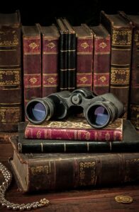 Binoculars and old books over wooden desk