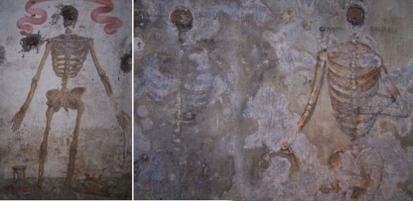 Totentänze konnten auf Kirchhofsmauern abgebildet sein, ebenso an Kapellen oder Beinhäusern. Der Schriftsteller Umberto Eco nennt den Totentanz die „sowohl gelehrte als auch volkstümliche Form der feierlichen Beschwörung des Todes“ in Kirchen und auf Friedhöfen. (Eco, S. 62 ff.) Der in den romanischen Sprachen verwendete, vielleicht aus dem Arabischen oder Herbräischen stammende Begriff macabre wurde als danse macabre verwendet. Hintergrund war das Aufkommen der Pest, die auch als Strafe verstanden wurde und etwa ein Drittel der europäischen Bevölkerung das Leben kostete. Es ging beim Totentanz nicht etwa darum, den Schrecken der Erwartung des Endes oder der Endzeit zu vergrößern, sondern um die Angst zu lindern und die Vergänglichkeit noch einmal bewusster ins Zentrum des Lebens zu stellen. Der Totentanz zeigt Päpste, Kaiser, Mönche, Männer, Frauen und junge Mädchen, die Skeletten oder einem als Verwesenden dargestellten allegorisierten Tod folgen. Als Musikant, Tänzer oder Reigenführer führt er die einzelnen Ständevertreter in der Reihe ihrer Rangfolge in seinen Tanz. Am Ende treffen sich die unfreiwilligen Tanzpartner zumeist im Beinhaus wieder und können die ständische Ununterscheidbarkeit ihrer Knochen wie folgt zu bedenken geben: