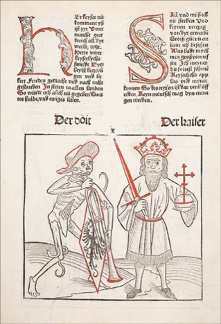 Um 1440 entstand in Basel der so genannte Große Basler Totentanz an der Friedhofsmauer des dortigen Dominikanerklosters, wahrscheinlich in Erinnerung an eine vorangegangene Pestwelle. Die 39 Bilder, die den Tod jeweils mit dem Vertreter eines Standes zeigen, sind mit vierzeiligen Strophen über und unter den Figuren versehen. Dem Kupferstecher und Verleger Matthäus Merian ist es zu verdanken, dass sich Bilder und Texte seit dem 17. Jahrhundert erhalten haben.