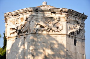 Der Bauforscher Hermann Kienast bescheinigt diesem gar „der besterhaltene Bau der Antike in ganz Griechenland“ zu sein. Stolze 13 Meter ist der „Turm der Winde“ hoch und wurde nach Entwürfen des makedonischen Astronomen und Architekten Andronikos von Kyrrhos errichtet . Dabei zeigt das oktogonale Bauwerk die Reliefs der acht von den Griechen verehrten Haupt- und Nebenwinde. Diese waren: Boreas, der Nordwind. Kaikias, der Nordostwind. Apheliotes, der Ostwind. Euros, der Südostwind. Notos, der Südwind. Lips, der Südwestwind. Zephyros, der Westwind. Und Skiron, der Nordwestwind. Auffällig, ist, dass alle Winde männlich sind; vier gereifte Männer mit Bart und Mantel stehen vier junge Männer mit Attributen wie Früchten, Kannen oder Blumen gegenüber. Unter jedem der Windreliefs war ursprünglich eine Sonnenuhr angebracht. Im Turm selbst befand sich eine Wasseruhr. Das Dach krönte, den archäologischen Untersuchungen zufolge, eine Figur (wahrscheinlich ein bronzener Triton), der als Wetterfahne fungierte und sich je nach Windlage in die entsprechende Richtung bewegte.