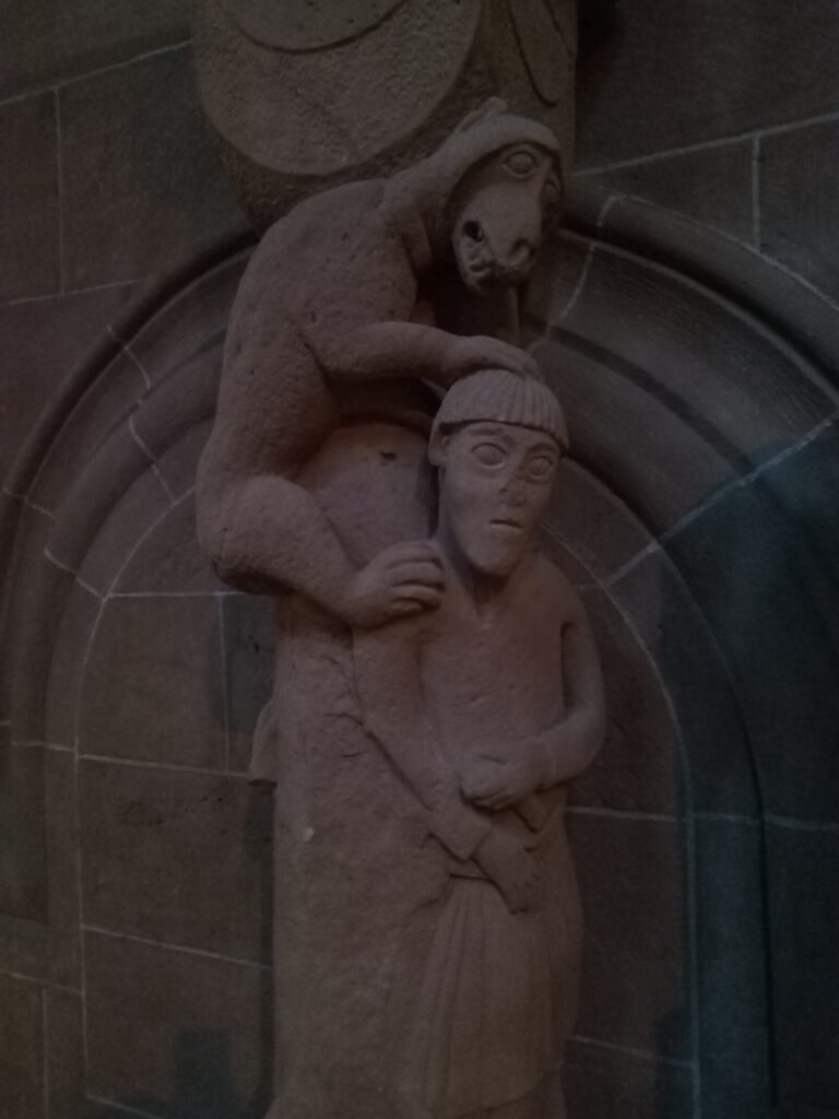 Da wäre zum Beispiel der „Basilikaschirm“ im Wormser Dom St. Peter (neben dem Hohen Dom St. Martin zu Mainz und dem Mariendom zu Speyer der kleinste der drei rheinischen Kaiserdome – wiewohl „klein“ in der Wahrnehmung des Besuchers schlussendlich eine Frage der Perspektive bleibt, solange es technisch nicht möglich ist, sich hintereinander in alle drei Gebäude zu beamen). Der Schirm wirkt auf den ersten Blick ein wenig skurril im Kircheninventar, ist aber eine wichtige Insignie, das sogenannte „Umbraculum“ (oder Conopeum). Ursprünglich handelte es sich hierbei um einen Schirm zum Schutz von Kantoren und Priestern bei Prozessionen; zusammen mit einer liturgischen Glocke (dem Tintinnabulum) steht das Umbraculum aber kennzeichnend für eine päpstliche Basilika. Im Jahr 1925 verlieh Papst Pius XI. dem Wormser Dom den Ehrentitel „Basilica Minor“, was die besondere Bedeutung des Gebäudes zum Ausdruck bringen sollte. Eine Ehrenrettung des Bauwerks und eine Rückbesinnung an kirchenpolitisch bessere Tage. Und Schuld daran trägt? Napoleon! Als linksrheinisches Gebiet gehörte Worms nach der französischen Besatzung zum Départment Mont Tonnère. 1801 wurde das bis dato bestehende Bistum Worms aufgelöst, 1816 verlor die Stadt sogar ihren Status als Reichsstadt. Damit wurde auch der Dom in den Stand einer einfachen Pfarrkirche zurückversetzt und war fortan Teil des Bistums Mainz. Es dauerte bis 1862, um das Bauwerk zu „rehabilitieren“. St. Peter wurde Propsteipfarrkirche und schließlich „Basilica minor“. Ein turbulenter Werdegang auf dem Schicksalsrad. Dazu passt auch, dass der Basilikaschirm keine Stiftung der 1920er Jahre ist, sondern sehr viel jünger und mit Hilfe von Spendengeldern finanziert. Dazu ein Statement des amtierenden Probstes Tobias Schäfer: „Mit dem wunderschön geschnitzten Basilikaglöckchen und dem Basilikaschirm […] sind wir nun auch in Worms gut gerüstet, sollte es dem Papst einmal einfallen, unseren Dom zu besuchen.“ (Der Mantel, 3/2016, S. 11) Solch ein Besuch wäre in der Tat ein mehr als nur versöhnliches christliches Glaubensbekenntnis, denn die Mehrzahl der Wormser sind Protestanten. Seit 1525 ist die Stadt evangelisch, wiewohl Bischof und katholische Geistliche ihre Sonderstellung behielten. Die Ungläubigkeit ob jener Spaltung ist auch dem Blick eines steinernen Löwen zu entnehmen, der vor dem Westchor aufgestellt ist. Er scheint schon recht lange auf ein Wunder zu warten.