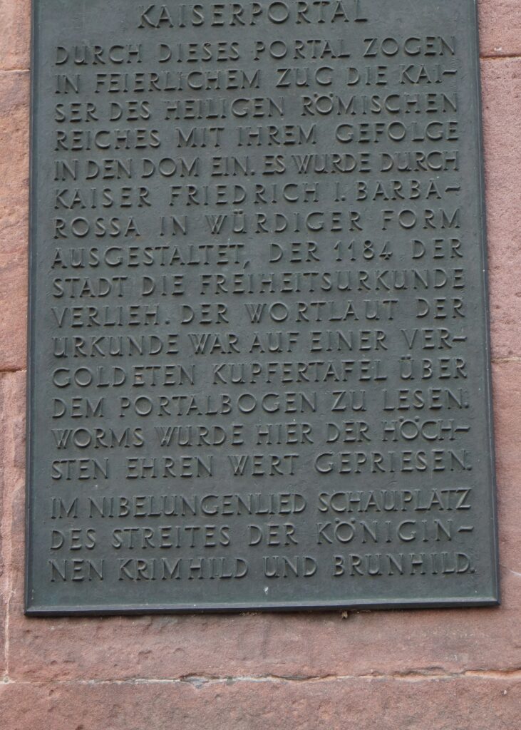 Auf der Inschriftentafel am Kaiserportal wird neben dem historischen Vermerk noch auf etwas verwiesen, dass literarische Herzen höherschlagen lässt. Es steht geschrieben: „Im Nibelungenlied Schauplatz des Streites der Königinnen Krimhild und Brunhild.“