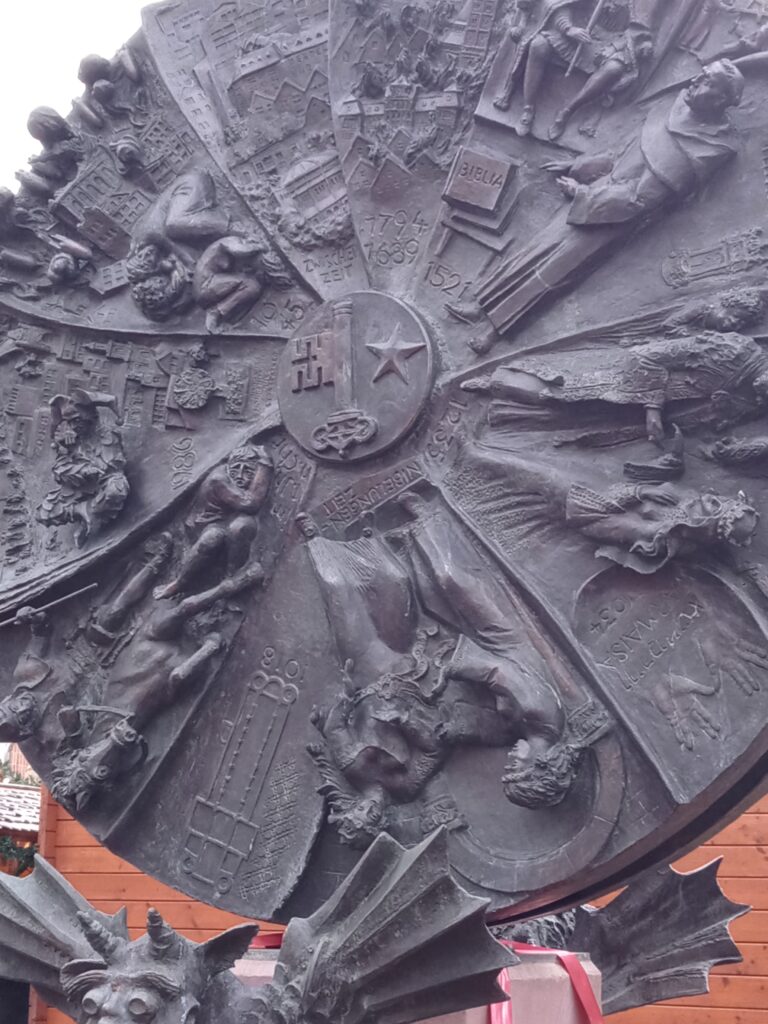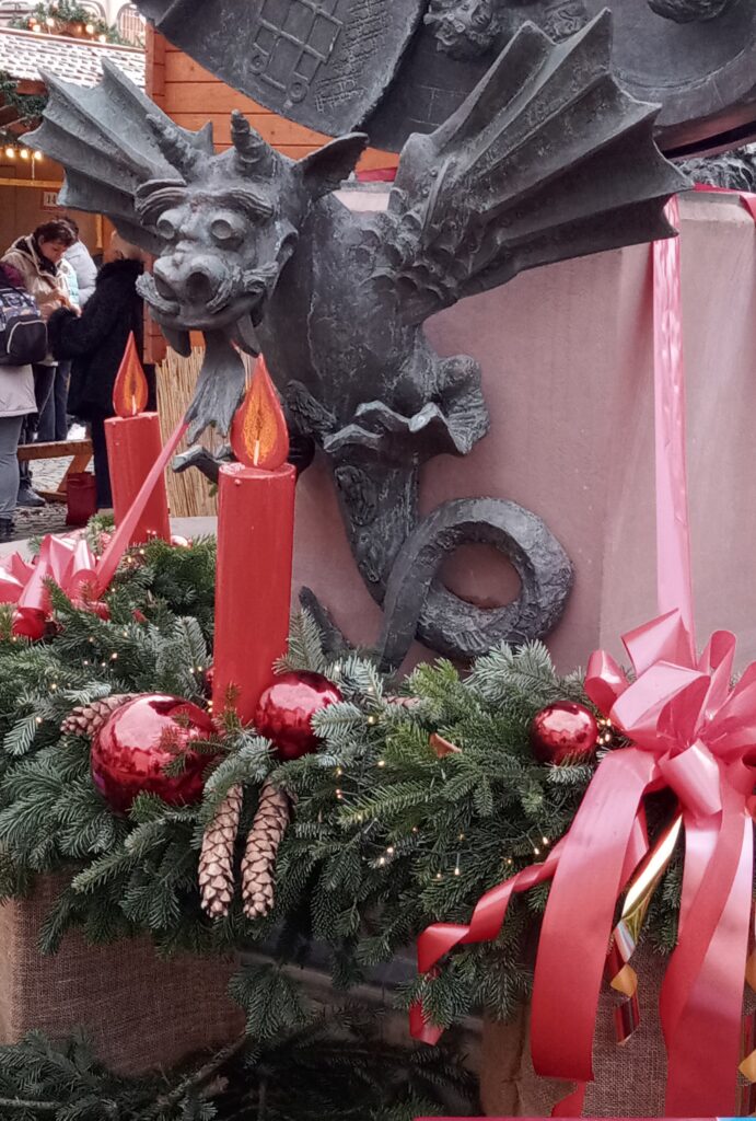 Mit seinen rund 85.000 Einwohnern ist Worms die typisch mittelgroße Stadt mit dem üblichen Verkehr, dem üblichen Gewusel, dem üblichen Alltag, den üblichen Shopping-Passagen, und nicht fehlen darf natürlich der übliche Einkaufsparcours für gestresste Autofahrer und müde Fußgänger. Hinzu gesellen sich die üblichen Schülergruppen, die nach der Domführung gar nicht schnell genug aus den (für sie) muffigen alten Mauern flüchten können – Kirche, Kultur, war da was? Auch in der Touristeninformation herrscht die üblich höflich-distanzierte Grundstimmung. Neugier vs. Alltagstrott. Wo sind denn nun die versprochenen Wunder? Auf dem Obermarkt vielleicht, wo die Miniatursteinvariante eines etwas zu freundlich dreinschauenden Drachens Feuer speit. Zur Weihnachtszeit (mit traditionellem Nibelungenglühwein) schaut es aus, als entzündeten die Flammen auf magische Weise die darunter aufgestellten Kerzen. Über dem Drachen dreht sich derweil stoisch und jahreszeitenunabhängig das Wormser Schicksalsrad. Es stammt aus dem Jahr 1986 und wurde vom Bildhauer Gustav Nonnenmacher (1914-2012) gestaltet. Beim Rotieren zeigt es historische Ereignisse der Stadt und Alltagsszenen. Wunder oder wundern? Man darf kurz ernüchtert sein. Dann heißt es, Erwartungen loslassen und auf die Suche gehen. Dank Google-Maps – oder indem man sich zur Orientierung seiner natürlichen Spracheinstellungen respektive des eigenen Sehvermögens bedient – kann der postmoderne Nibelunge (oder die Nibelungin) so manche Entdeckung machen und es dabei doch ganz unerwartet schaffen, aus der Zeit zu fallen.