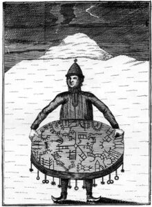 Noiadi präsentiert seine Trommel (Kupferstich aus dem 18. Jh. von O. H. von Lode nach einer Zeichnung des norwegischen Missionars Knud Lem