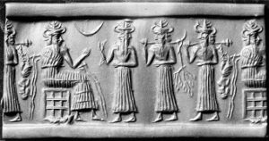 AKKADIAN CYLINDER SEAL. /nEa, the god of water and wisdom and the teacher of handicraft and magic, seated at left, with a bird-man dangling from a mace at far right. Akkadian cylinder seal, c2330-2180 B.C.