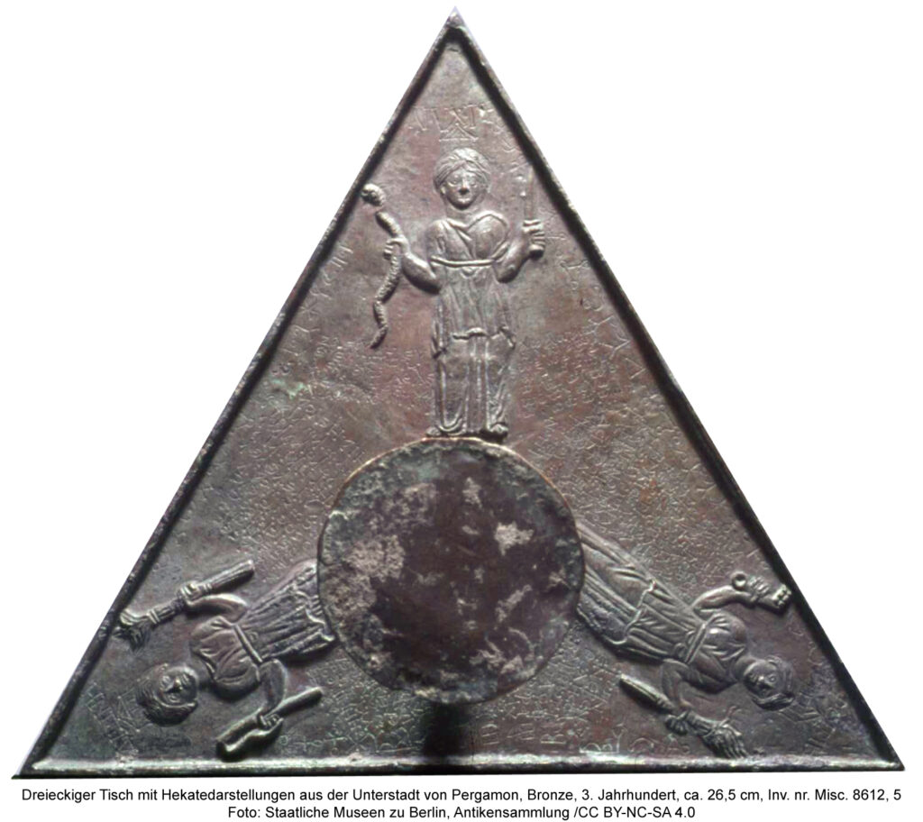 In der antiken Metropole Pergamon wurde eine dreieckige Zaubertafel mit Aufsatz ausgegraben, die möglicherweise als Räucheraltar verwendet wurde. In jeder Ecke befindet sich eine Hekatefigur zusammen mit Zauberzeichen und anderen Beschriftungen. Eine Abbildung und weitere Informationen zu Hekate findet man kostenlos in: Richard Wünsch, Antikes Zaubergerät aus Pergamon, Berlin 1905, 11-14, zum Beispiel über die Heidelberger Universitätsbibliothek kostenlos verfügbar: https://digi.ub.uni-heidelberg.de/diglit/wuensch1905/0022. Seit Kurzem stellt die Antikensammlung Berlin auch ein Foto zur Verfügung: