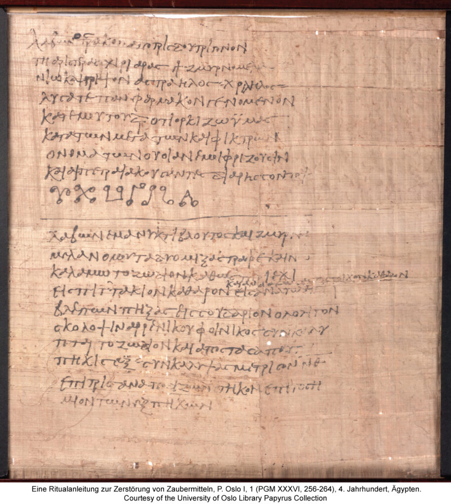 „Astraêlos, Chraêlos, zerstört jedes Zaubermittel, das sich gegen mich, NN, richtet! Denn ich beschwöre euch bei den großen und furchtbaren Namen, vor denen die Winde erschauern und die Felsen beim Hören zerreißen!“ (Zauberzeichen) [PGM XXXVI, 256-264, 4. Jahrhundert, Griechisch. Übersetzung nach Preisendanz 19742, 171.]