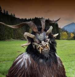 Im östlichen Alpenraum, in Österreich, Südbayern, Südtirol, Ungarn, Slowenien, Tschechien und Kroatien ist es der Krampus, der als Nikolausbegleiter umherstreift. Schon am 5. Dezember, am Krampustag, macht er die Runde. Im Gegensatz zum Knecht Ruprecht ist sein Aussehen, ähnlich wie das der Perchten, eher teuflischer Natur. Schon sein Name (mittelhochdeutsch Krampen > Kralle; Bairisch Krampn > etwas Lebloses oder Verdorrtes) verweist darauf, dass man es vorsichtig mit ihm angehen sollte. Der Krampus bestraft die bösen Kinder (oder böse Erwachsene). Noch heute haben sich die Krampusläufe erhalten. Mit Ruten ausgestattet laufen Menschen in tierähnlichen Verkleidungen durch Dörfer und Städte, um Bewohner (oder Touristen) zu erschrecken. Begleitet werden sie durch das Geläut von Kuchglocken, Schellen und Rasseln. Am auffälligsten sind die Masken, die mit Ziegen-, Widder- oder Steinbockhörnern und Fell versehen sind. Beim Krampus gilt: Je dämonischer und hässlicher desto besser. Oft gilt es als Mutprobe, einen Krampus zu reizen und ihm dann zu entfliehen, ohne von seiner Birkenrute erwischt zu werden. Der Krampus kann einzeln, aber auch, erneut ähnlich wie bei den Perchten, in Gruppen auftreten. In manchen Regionen Tirols und Österreichs werden diese Traditionen fleißig gepflegt, obwohl es häufiger vorkommt, dass sie als Massenspektakel negativ in die Schlagzeilen geraten.