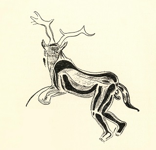 Eine weitere, wenn vielleicht nicht sogar die bekannteste bildliche Darstellung eines sich in ein Tier verwandelnden Schamanen prähistorischer Zeit finden wir in der Drei-Brüder-Höhle am Fuße der Pyrenäen. Bekannt ist das Bild auch unter der Bezeichnung der „Zauberer von Les Trois-Frères“ oder, wie ihn der französische Prähistoriker Henry Breuil (1877-1961) bezeichnete, der „gehörnte Gott“. Letzterer findet sich in Tanzpose auch im großen Wandbild der Höhle wieder. „Das Mischwesen besitzt einen buschigen Schwanz, unter dem menschliche Genitalien zu sehen sind. Der Körper eines Tieres (vermutlich Wisent oder Hirsch) endet vorn in wiederum menschlichen Extremitäten, auf deren Ende die fünf Fingerglieder als Striche angedeutet sind. Das Mischwesen hat einen langen Bart und trägt auf dem Kopf ein Rengeweih – keine Hörner!“ (S. 25) Vor allem das Geweih wird als Schmuck zur schamanischen „Ausstattung“ gerechnet. Ob es sich bei den Abbildern tatsächlich um eine Schamanendarstellung oder bloße menschliche Fantasie handelt, ist bis heute nicht abschließend geklärt und wird es vermutlich auch nie. Auch dies – keine endgültige Erklärung für etwas zu haben – kann Magie sein.