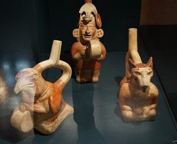 Weiter führt der Rundgang nach Südamerika zu den Kulturen der Moche und Chimú. Im Gegensatz zur Yoruba-Religion ist in diesen Kulturen der Dualismus das grundlegende Prinzip für die Weltordnung. Gegensätze wie Tag und Nacht, oben und unten werden dabei rituell zusammengeführt. Nur auf diese Weise kann die Ordnung aufrechterhalten werden. Dies drückt sich u.a. in Darstellungen von und auf Keramiken aus, so etwa bei Trinkgefäßen mit zwei Ausgüssen, Doppelgefäßen mit zwei Gefäßkörpern, verbunden durch eine vertikale Brücke oder auch durch Gefäßpaare.