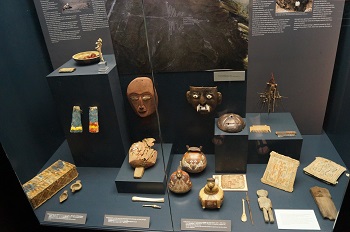 Eine andere Vitrine widmet sich der Nazca-Kultur, die zwischen 200 v. Chr. bis ca. 600 n. Chr. in Südperu existierte. Bekannt wurde sie durch die Nazca-Linien, heute zum Weltkulturerbe gehörend, kilometerlange Linien bzw. Scharrbilder, welche die Umrisse von Tieren und geometrischen Formen zeigen und erst von der Luft aus vollständig sichtbar werden (entdeckt wurden sie erst 1926). Was es damit auf sich hat, ist bis heute nicht abschließend geklärt. Eine Theorie lautet, dass die Linien die Lagen von unterirdischen Kanälen angezeigt hätten, weitere Vermutungen bringen die Zeichnungen mit Sternenkonstellationen, zeremoniellen Zeichen und einem Kalendersystem in Verbindung.