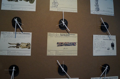 Die Zeit des Betrachters. Die Zeit der Objekte. Die Zeit der Reise von beiden. Und die „Zeit der Anderen“. Letzteres bezieht sich auf die Vorstellung der europäischen Gelehrte, Kulturen in sogenannte menschliche Entwicklungsstufen zu unterteilen; demnach befände sich also jede Kultur in einer eigenen Art von Zeitblase mit der Konsequenz, sich nur selbst reproduzieren und damit nicht Anteil an der Geschichte selbst haben zu können. Ihre Zeit sei also eine andere Zeit auf der Skala der „allgemeinen Menschheitsentwicklung“, wobei die europäische Zivilisation als, überspitzt formuliert, Krone der Schöpfung betrachtet wurde. Diese Kategorisierung betraf auch die von den Kulturen produzierten Objekte, die damit innerhalb ihres eigenen Kontextes nicht nur eine Abwertung erfuhren, sondern auch zeitlich keine Rolle mehr spielten. Eine Auffassung, die sich im Zuge der Globalisierung und einer allgemeinen Neuausrichtung des Zeitverständnisses größtenteils relativiert hat. Denn um Geschichten zu erzählen, braucht man die Zeit ebenso wie die Blicke.
