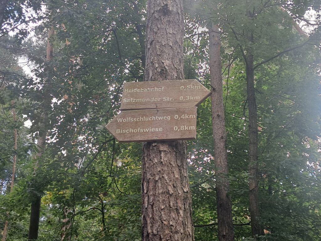 Schon beim Betreten der Heide (ich wähle den Zugang an der Straßenbahnhaltestelle „Heide-Universitätsklinikum“) ist spürbar, dass man sich an einem Ort befindet, der so ambivalent ist, wie es Menschen bisweilen sein können – einladend und misstrauisch, verträumt und gruselig. Den einzigen Mit-Wanderern begegne ich gleich zu Beginn der Tour, ansonsten durchstreife ich den Wald allein. Der Wind rauscht mal mehr mal weniger intensiv durch die Baumkronen. Holz knarzt. Im Gewirr der Wege und Nebenwege ist nicht immer klar, welchen Abzweig ich nehmen muss. Irgendwann fällt mir auf, dass ich an einem Kreuzweg stehe, einem von vielen, die es in der Dölauer Heide gibt. Angeblich standen an allen Kreuzwegen früher reale Kruzifixe. Ob aus Stein oder Holz, als Gedenk- oder Nischenkreuze, ist vergessen. Zahlreiche Wegweiser, meistens an Baumstämmen prangend, haben längst ihre Plätze eingenommen und sorgen weniger für himmlischen Beistand als dafür, dass Wanderer das heid(n)ische Wanderziel erreichen. Zumindest theoretisch, denn einige Beschriftungen sind bereits arg verblasst.