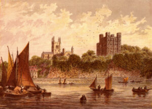Rochester, Kent, England, situated on the River Medway. Viewed from across the river on which are sailing barges are the 12th century castle and the Cathedral. As ‚Cloisterham‘ the city is the setting for Charles Dicken’s last, unfinished, sensation nove