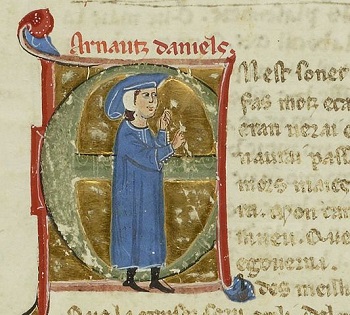 Als Dante mit Vergil im siebten Kreis des Fegefeuers wandert, kommt ihm Arnaut Daniel entgegen. Auf ihn verweist ein Dichter, den Dante zuvor getroffen hat, Guido Guinizzelli, und sagt: Jetzt kommt der, der noch besser ist als ich, „il miglior fabbro del parlar materno“, ein besserer Schmied der Muttersprache. Angeblich soll er auch Prosaromane geschrieben haben – vielleicht sogar den, bei dessen Lektüre sich Francesca und Paolo geküsst haben (Inferno V) – doch das ist wohl eine Fehlmeldung. Dante erweist dem Entgegenkommenden die größte Ehre, indem er ihn provenzalisch sprechen lässt: „Ieu suis Arnaut, que plor e vau cantan“ – ein stolzer und trauriger Satz, „ich bin Arnaut, der weint und singend geht“.