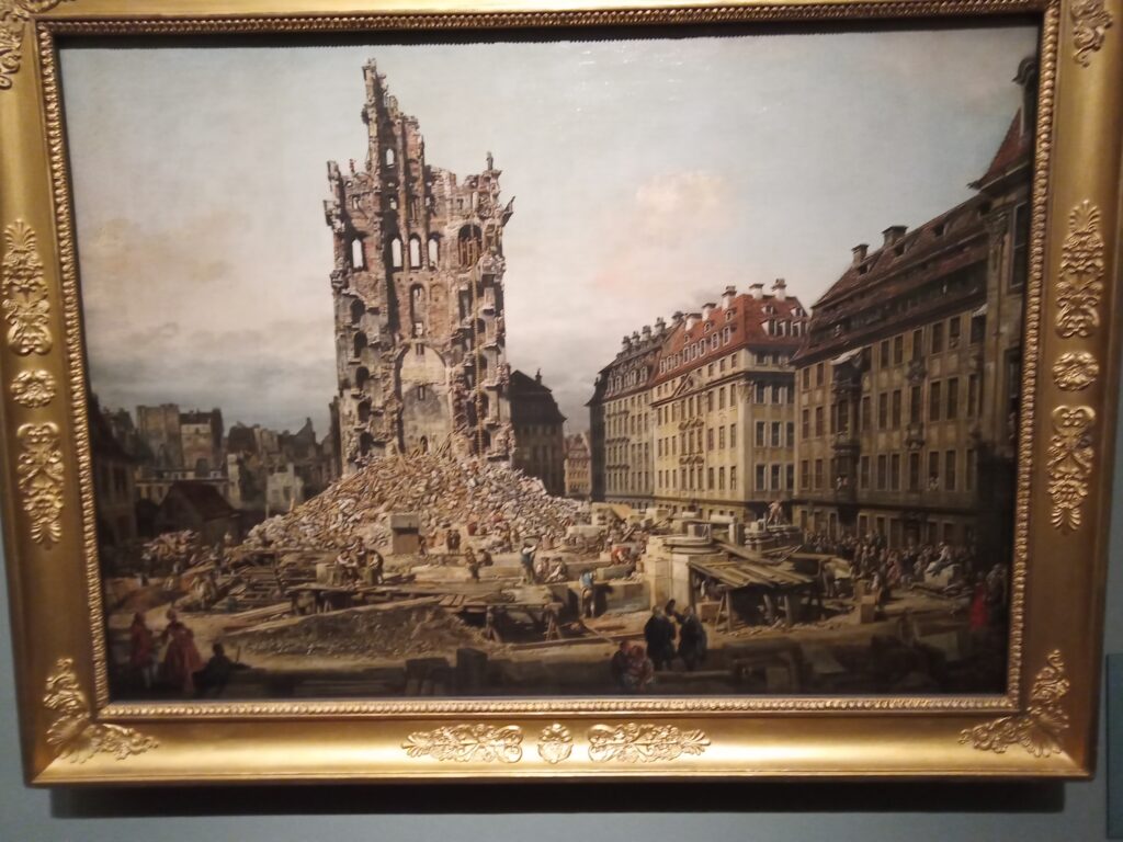 Obwohl Bellotto als königlich sächsischer Hofmaler gilt, ist er formal (d.h. urkundlich) doch nie dazu berufen worden, zumindest fehlen dazu bislang die schriftlichen Quellen. „Doch signierte er ab 1748 seine Radierungen mit dem Zusatz ‚peintre royal‘, und wird auch in späteren Schriftstücken als ‚Hofmaler‘ bezeichnet.“ (Ebd. S. 28) Nach verschiedenen Intermezzi in Wien und München kehrte Bellotto 1761 nach Dresden zurück, das vom Siebenjährigen Krieg versehrt war. Ein Umstand, den der Künstler auch in seinen Werken Rechnung trägt, so u. a. in der Verdute Die Trümmer der ehemaligen Kreuzkirche zu Dresden (1765), die auf erschreckende Weise an Fotografien der Ruine der im Februar 1945 zerstörten Frauenkirche erinnert.