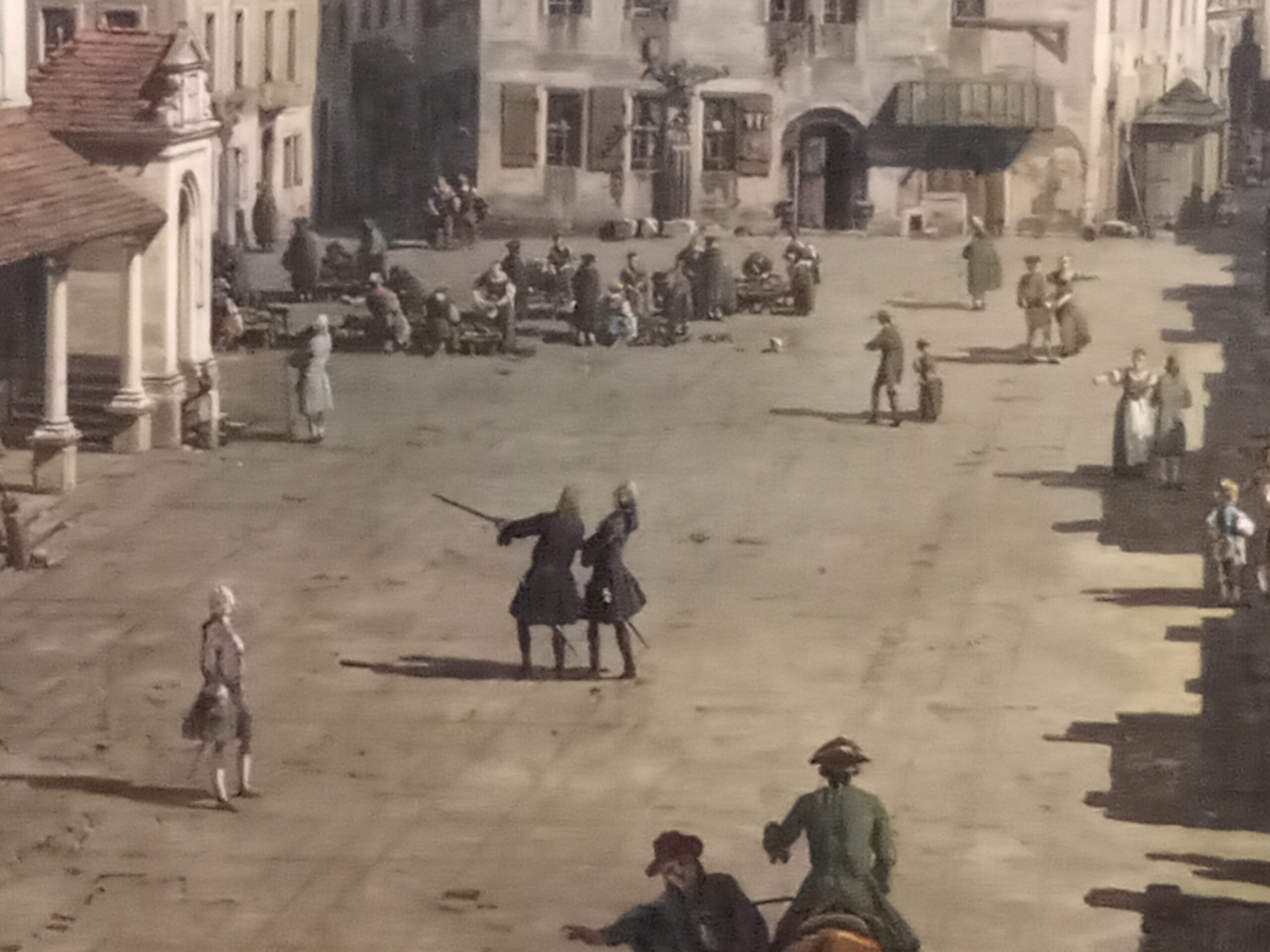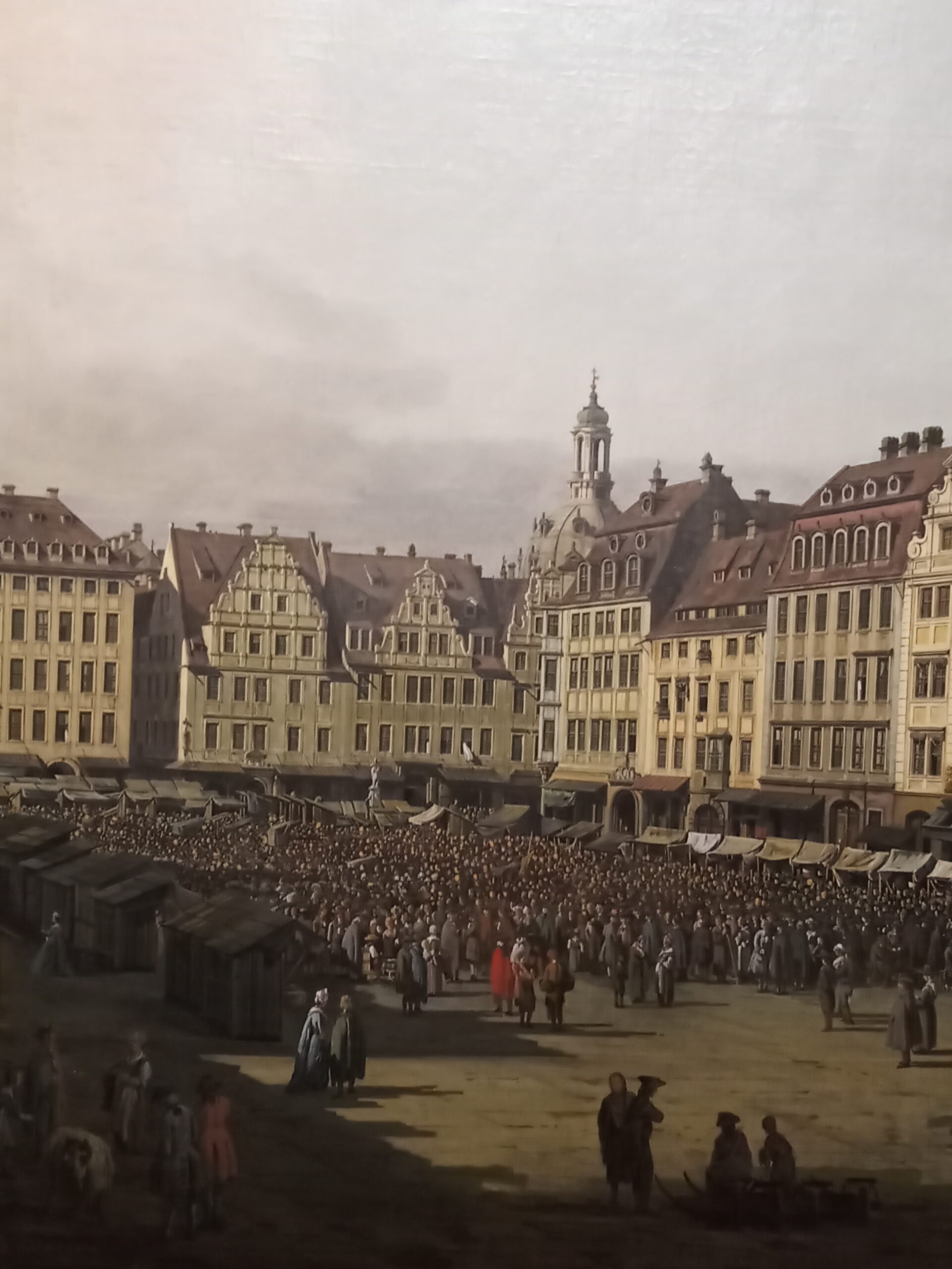 Die Vedute ist auch bekannt als „Canaletto-Blick“. Interessant ist neben der farblichen Klarheit und den Details, wie den sich auf den Wasser spiegelnden Silhouetten oder den Schatten der Figuren, welche, so wie die gesamte Ansicht, einer westlich stehenden Abendsonne Rechnung tragen, dass die Frauenkirche im Vergleich zu der sich im Bau befindlichen Hofkirche recht klein anmutet. In der Ausstellung sind diese Größenunterschiede mittels eines virtuellen Bildschirms deutlich gemacht. Ein Detail, das dem Betrachter nicht unmittelbar auffällt, aber für Bellottos Ansichten typisch ist, um durch perspektivische Änderungen mehr räumliche Tiefe für die Szenen zu erzeugen. Vielleicht eines der eindrücklichsten Wiedererkennungsmerkmale, das dazu verleitet, sich den Bildern langsamer und intensiver zu widmen. Entschleunigung scheint den Details geradezu eingeschrieben zu sein, und Details gibt es unzählige zu entdecken – sie scheinen in jedem Zentimeter Leinwand geradezu auf den Betrachter zu warten und wirken dabei wie Standbilder eines Films, der sich via Vorstellungskraft nach Belieben vor- oder zurückspulen lässt. Vor allem die Schatten verstehen zu faszinieren, nicht zuletzt, da sie sich dem Auge erst nach und nach offenbaren, um plötzlich wie selbstverständlich da zu sein. Im Gegensatz zu den mythendurchdrungenen und religiös aufgeladenen Großformaten von Rubens, Rembrandt oder Tintoretto ein Stockwerk höher wirken Bellottos Werke nüchtern und eher klein, aber auf ihre Weise fast schon unheimlich intensiv. Der Zauber liegt hier, wie eingangs erwähnt, im wahrsten Sinne des Wortes im Detail.