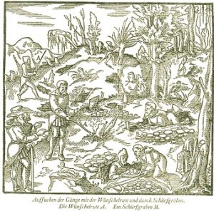 Exploring the passages with a divining rod and through trenches, historical account from Georgius Agricola De re metallica libri XII, Berg- und. Image shot 2013. Exact date unknown.