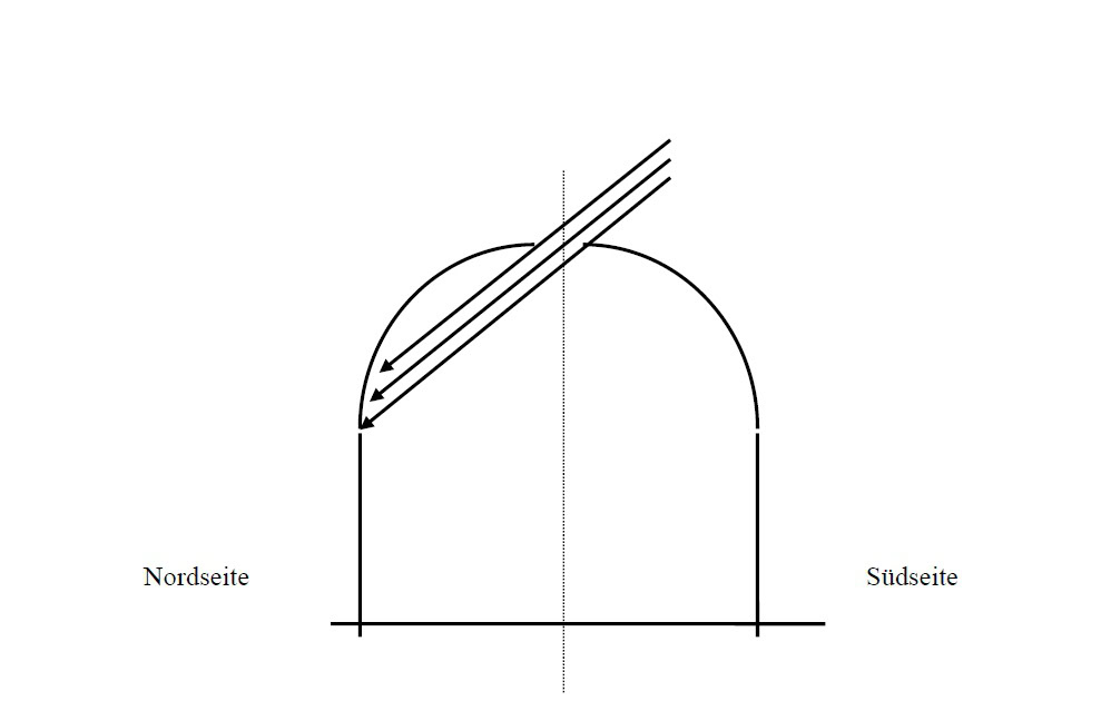 Mehr oder weniger ist die Kuppelschale eine Sonnenuhr. Man kann sich gut vorstellen, daß die Strahlen im Sommer weiter unten, im Winter weiter oben in der Kalotte auftreffen. Zur örtlichen Mittagszeit erreichen sie die Kassettenreihe direkt über der Tür. Das sieht dann so aus: je höher die Kassette liegt, desto kälter ist es draußen.