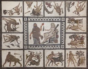 Labours of Heracles depicted in the Roman mosaic dated from the 3rd century AD from Lliria (Valencia Province, Spain) on display in the National Archaeological Museum (Museo Arqueologico Nacional) in Madrid, Spain.