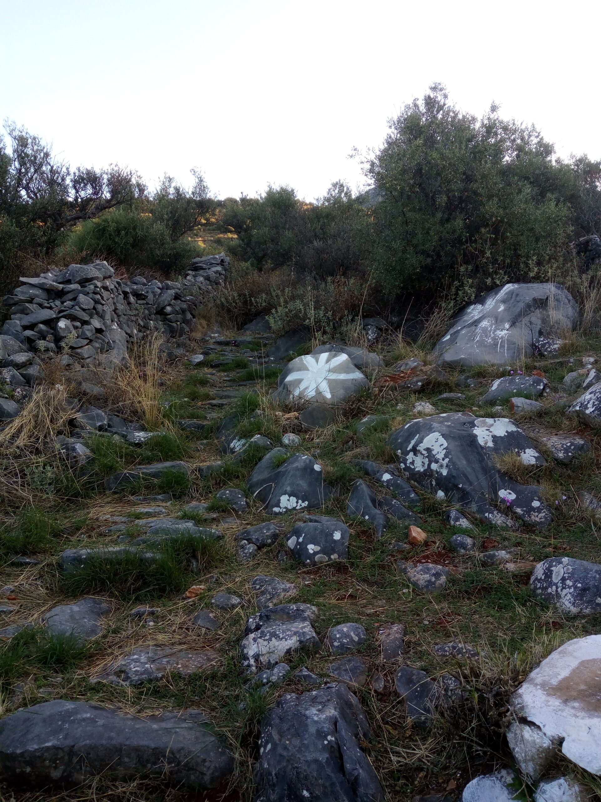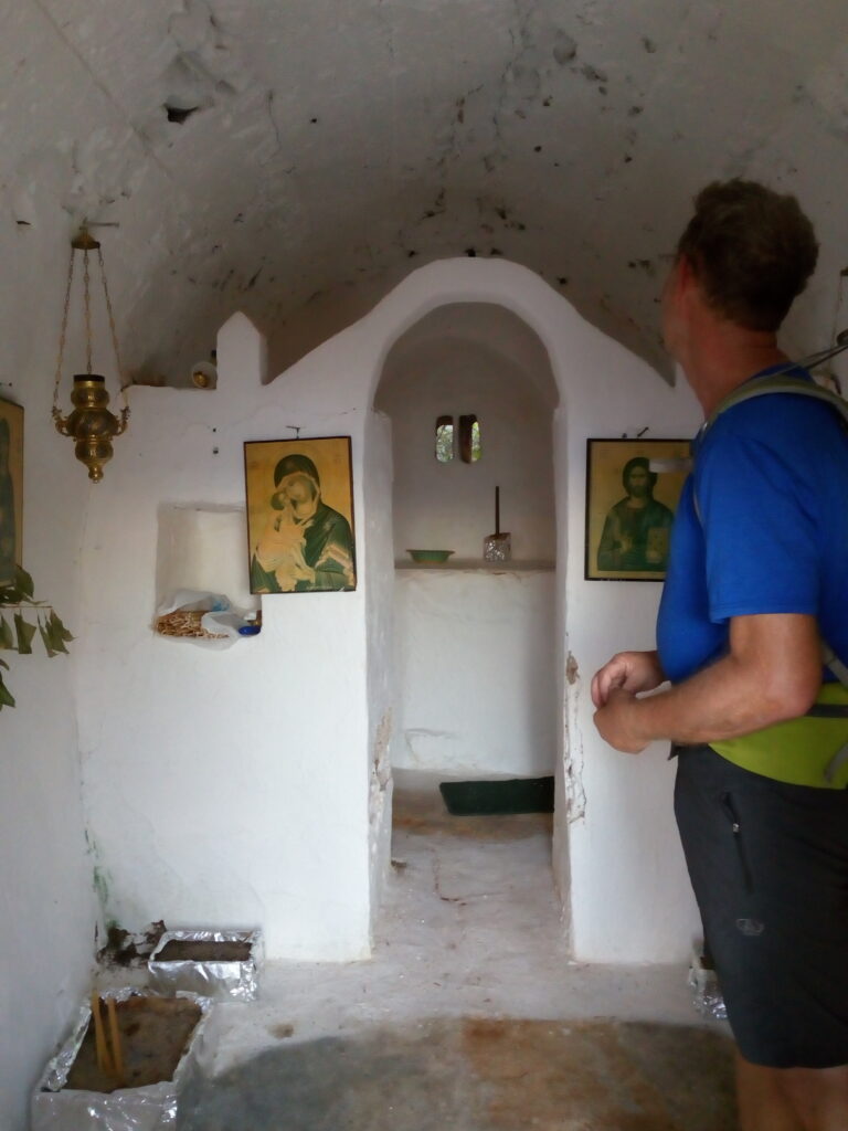 Das Meer war noch grau und stumpf, die Luft frisch, ein wenig kühl. Aus dem nächsten Dorf war das Krähen der Hähne zu hören. Das Einrollen der Schlafsäcke, das Umziehen und Packen – es dauerte eine gute halbe Stunde, bis wir bereit waren zum Aufbruch. Die Klippen rückten schon bald immer enger an den Steilhang heran, kein Wanderweg schien mehr weiterzuführen. Wir mussten bergauf zu den Dörfern Thalamos und Platano gehen. Denn dort oben verlief die Straße, die weiter nach Süden führte, nach Areopoli und dann bis zum Kap Tenaro, unserem vorläufigem Ziel. Zwei, drei Stunden gingen wir auf einem schmalen Pfad aufwärts, unterbrochen nur von einer kurzen Rast an einer Kapelle. Der Weg wurde nach einiger Zeit noch schmaler, zweigte sich auf in mehrere Fußpfade, brachte uns schließlich in ein kleines Tal, dessen Ende von dichtem Gestrüpp versperrt war. Erst nach einigem Hin und Her fanden wir einen neuen Pfad, der am Rand des Tales wieder weiter aufwärts führte. Unvermittelt standen wir nach kurzer Zeit an einem staubigen Feldweg, der uns bis nach Thalamos führte.