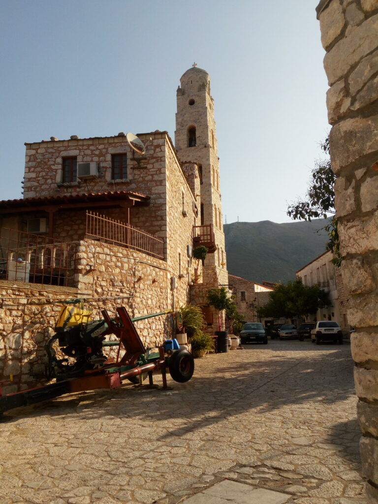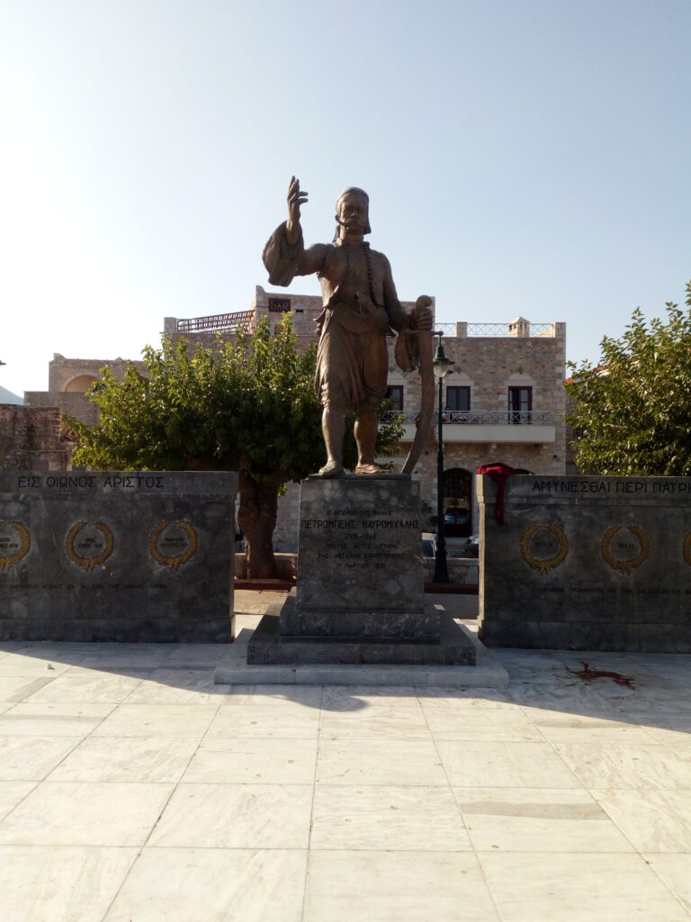 In den Gassen von Areopoli schien sich seit der Zeit des Mavromichalis nicht sehr viel verändert zu haben. Um den zentralen Platz, die Platia Athanaton mit dem Denkmal für Petros Mavromichalis, gab es eine Reihe von Restaurants und Läden, nur wenige hundert Meter weiter aber gingen wir schon durch menschenleere Gassen. Zu Füßen der Turm-Kirche Taxiarchis, auf der am Vorabend des griechischen Befreiungskampfes die Fahne der Mani mit der Inschrift „Sieg oder Tod“ wehte, steht ein leichtes Infanteriegeschütz am Straßenrand, in Tarnfarben gestrichen. Eine Reminiszenz an einen der letzten Kriege? Eine Hommage an Mavromichalis und seine Palikaren? Eine lokale Form der Ausgestaltung des öffentlichen Raumes, so wie in anderen Städten Blumenkübel aufgestellt werden?