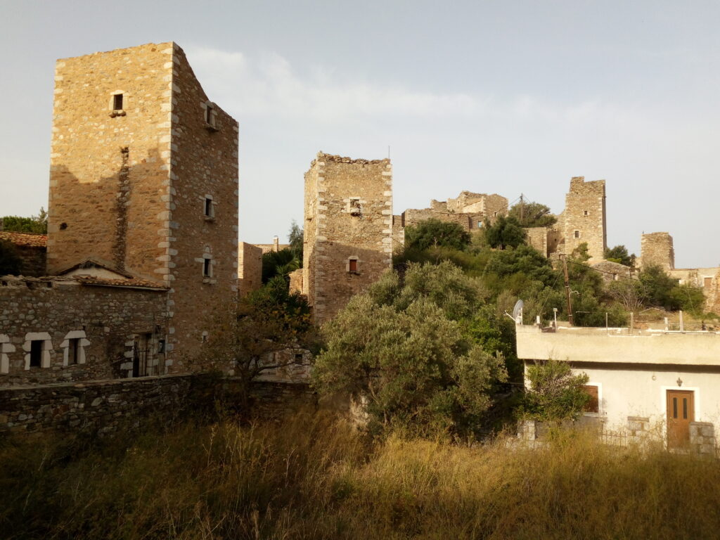 Die häufigsten und bedeutendsten Bauwerke der Mani sind – noch vor den Türmen – die zahllosen Kirchen und Kapellen. Und selbst für griechische Verhältnisse dürfte ihre Dichte bedeutend sein. Und es scheint mir fraglich, ob es überhaupt eine Weltgegend gibt, die der Mani in dieser Hinsicht nahekommt. Selbst abseits der Straßen und Ortschaften gingen wir nirgends länger als eine Stunde, ohne auf eine Kapelle zu stoßen. Die Anzahl der Türme hingegen wuchs proportional zu unserem südlichen Kurs. War der restaurierte Turm der Familie Mourtzinos in Kardamili noch eine Attraktion, nahm man spätestens ab Gerolinemas die auf den Höhenzügen wie zahllose Stacheln aufragenden Türme als etwas vollkommen Gewöhnliches hin.