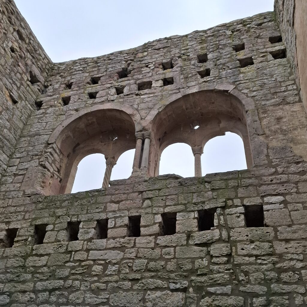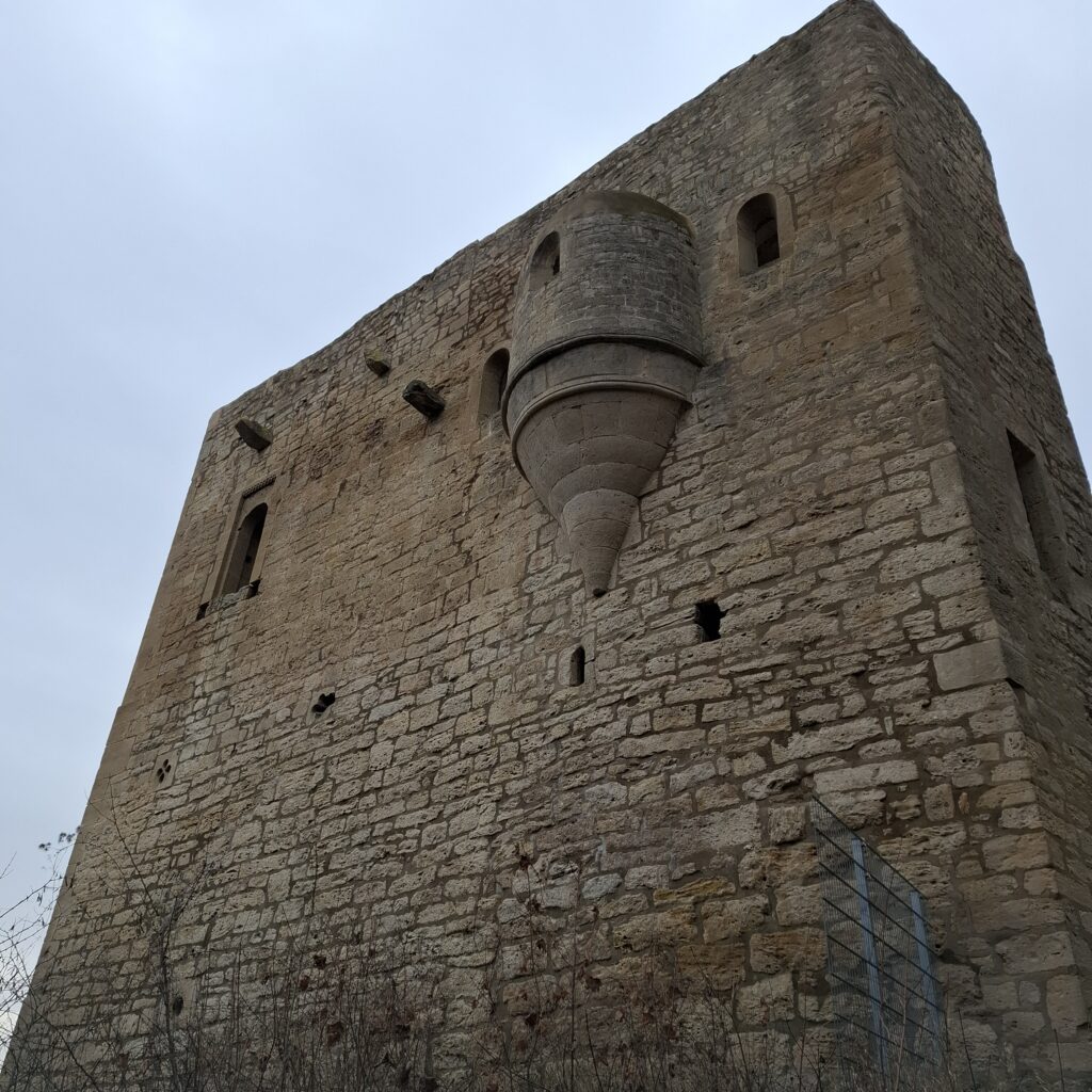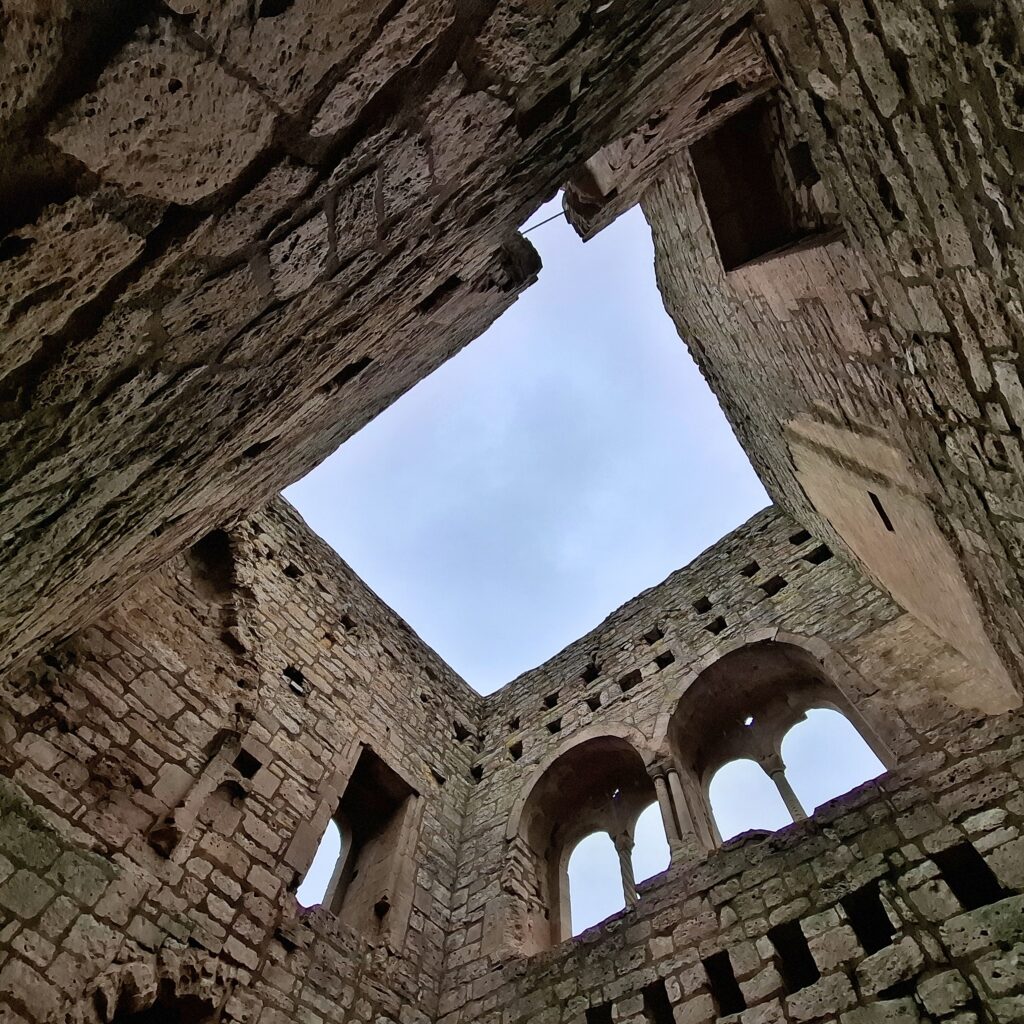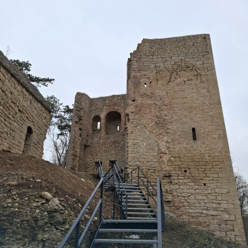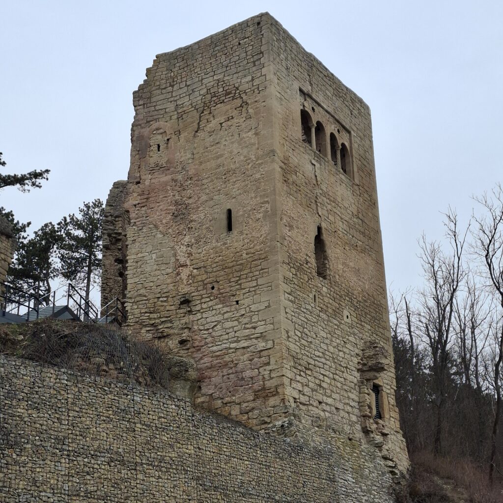 Hinter den UKJ-Wiesen geht es zunehmend steiler bergauf. An Grünflächen und Gärten geht es vorbei bis zu einer Schranke, hinter der es dann richtig sportlich wird. Der Weg ist zwar nicht lang, verlangt allerdings dank ordentlicher Steigung dem nur durchschnittlich trainierten Wanderer einiges ab. Ziemlich außer Atem stehe ich schließlich vor der Burganlage, deren beeindruckender Wohnturm vor mir aufragt. Mein Blick geht an der Südfassade nach oben, gleitet am Mauerwerk entlang und verweilt an der säulengetragenen Doppelarkade – einem der markanten baulichen Elemente der Anlage mit typischen Stilelementen der Romanik. An der Ostfassade des Turms ragt ein Kapellenerker heraus. Ich gehe an den Burgmauern entlang und steige die Holz- und Metallstufen hinauf, die mich in das Burggelände hineinführen. Da stehe ich nun auf der Treppe, blicke in den Burghof und auf die Gebäudereste und versuche mir das alltägliche Leben vorzustellen, das sich hier vor rund 750 Jahren abgespielt hat. Ich sehe vor meinem inneren Auge geschäftiges Treiben: Handwerker bei der Arbeit, Mägde beim Wasserholen, Knechte beim Abladen eines Pferdefuhrwerks. Der Alltag war hart und hierarchisch durchorganisiert – das Leben auf einer Burg war alles andere als romantisch, auch wenn uns das manche Filme und Bücher glauben machen wollen.